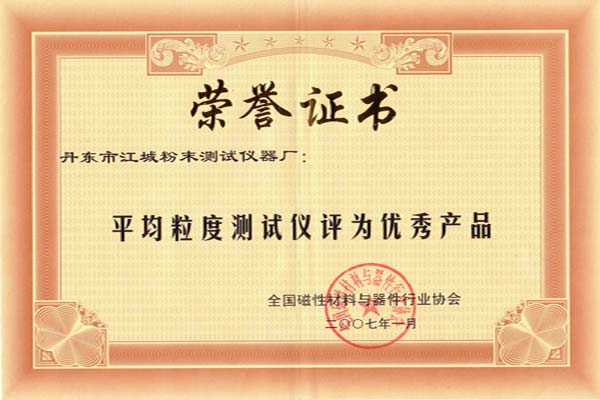 热烈祝贺丹东市江城粉末测试仪器厂所生产的平均粒度测试仪,在2006年全国磁性材料与器件行业协会为了庆祝成立20周年而举办的优秀产品(优秀科技成果)评选中,经专家和相关企业的严格评审,我单位是全国唯一被授予“平均粒度测试仪”优秀产品(优秀科技成果)称号。并予2007年元月获得荣誉证书和优秀产品证书!